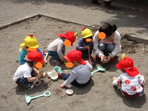 今日は白山公園にお散歩に行って来ました。砂場に行くと、アリを見つけたお友達が手で捕まえたり、保育者がコップに入れたりして観察をしました。コップやお皿に砂を入れて型抜きをしたり、カンパーイとコップをならしてパーティーごっこも楽しみました。