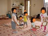 ピアノの音に合わせて歩いたり、止まったり、音を聞き分けてタンバリンを叩きながら歩いて、ジャーンの低音で頭にタンバリンを乗せて止まったり、休んだりしながら楽しく身体を動かして遊びました。