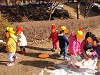 公園で雪遊びをしました。コップに雪を入れてペタペタと固めて型をとり、上に枯れ葉を差してロウソクに見立てて、ケーキを作りました。「ハッピーバースデー」の歌を歌って最後に「フゥー」と消す真似をして手をパチパチと叩いて喜んでいました。