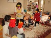 鬼が登場!自分たちで作った鬼のお面をつけて、豆の代わりにカラーボールを投げました。保育者にしがみついて顔をかくしている子どもや元気な声で「おにはそと」「ふくはうち」と投げている子どもと様々でしたが楽しい体験をする事が出来ました。
