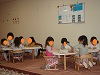 窓の飾りでタンポポと蝶々を作りました。蝶々は羽の形した画用紙にクレヨンでお絵描きをしてタンポポは折り紙の切り紙をタンポポの上に糊付けをしました。どの子も保育者に教わりながらペタペタと貼って楽しそうに作業に取り組んでいました。