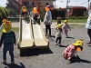 自然公園で散歩していると芋虫を見つけた子ども達、全員で芋虫を囲んで、虫の動きを観察していました。ひっくり返ったり、クネクネ動く様子をじっと見ていました。公園では、滑り台やスプリングトイに乗ったり、土でお団子を作ったりしました.他園のお友だちと仲良く遊ぶ様子がほほえましかったです。