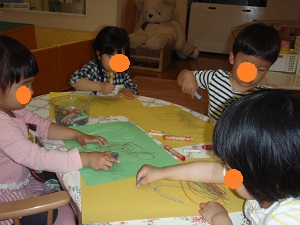 「パパと何して遊んでるかな?」とか「パパだいすき」など話しながら、プレゼント作りをしました。自分の好きな色の画用紙を選び、クレヨンで模様を描きました。八つ切りの画用紙にのびのびと描いていました。丸シールも貼り、その後別の画用紙にパパの顔を作りました。出来上がりを楽しみに作っていました。