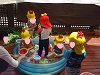 プールの中でお友だちと玩具で遊び、笑い声を上げて楽しく遊んでいました。