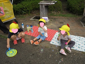 白山公園にお散歩に行き、しゃぼん玉遊びをしました。ストローで上手に「ふー」と息をしてたくさんのしゃぼん玉をとばしたり、追いかけたりして元気いっぱい遊びました。