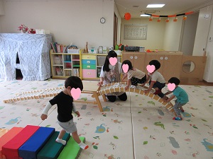 サーキット遊びをしました。太鼓橋ややわらか階段を使って元気いっぱい身体を動かして遊びました。