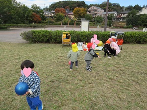 白山公園にお散歩に出かけました。芝生広場でボール遊びをしてたくさん身体を動かして遊びました。ひよこ組はシートの上で玩具遊びをしたり、芝生や落ち葉に触れて楽しみました。