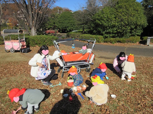 白山公園へ散歩に出かけ芝生広場で落ち葉遊びをしました。落ち葉を雨の様に降らせたり、玩具の熊手で落ち葉を集めて山を作って遊びました。