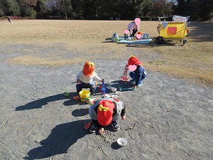 公園の芝生でレジャーシートの上で好きな玩具で遊びを楽しんでいる0歳児のお友だち。1,2歳児の子ども達は砂場セットを広げて砂利や木の枝、石ころ等色々な物に触れて遊んでいました。