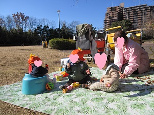 0歳児のお友だちは、シートの上で玩具で遊びました。気になる玩具に手を伸ばして、楽しそうに遊んでいました。