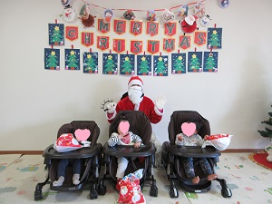 クリスマス会をしました。皆で歌を歌い、スケッチブックシアターでクリスマスのお話を聞きました。そしてベル演奏「きらきら星」でベルの音色を静かに座って聴いていました。ジングルベルの曲に合わせて、子ども達が鈴を鳴らしているとサンタさんの登場。少し驚いている子もいましたが、プレゼントに目をキラキラ輝かせて喜んでいました。最後はサンタさんと「ハイチーズ」