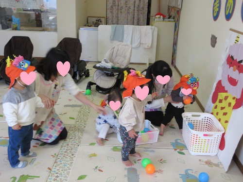 鬼の絵に向かって豆の替わりにボールを投げました。最初にひよこ組さんが投げました。鬼を怖がっているお友だちもいましたが、先生と一緒に頑張って投げていました。