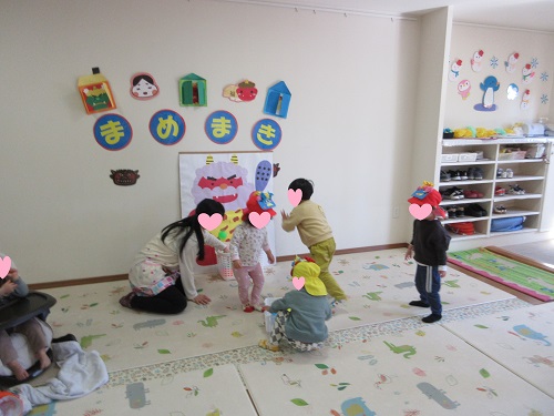 ひよこ組さんの次に、赤組・黄組のお友だちが豆まきをしました。「鬼は、そとー!福は、うちー!」と大きな声で言いながら楽しそうに投げていました。