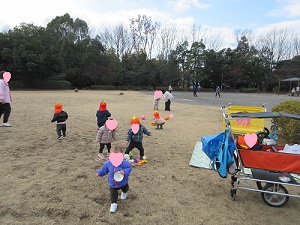 公園で遊びました。芝生の上を探索してよちよち歩きのお友だち。ベビーカーに揺られて心地よく眠っているお友だち。ボールを「まてまてー」と笑顔で追いかけているお友だち。皆元気に外遊びを楽しんでいました。