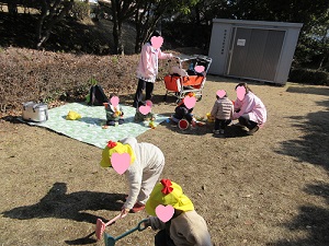 レジャーシートの上で好きな玩具を手に持って遊んでいましたが、友だちが楽しそうに遊んでいる姿を見て「ぼくも」というように這い這いで後を追っている姿がとても微笑ましかったです。またボール遊びやドングリを見つけて、沢山集めて遊んでいました。