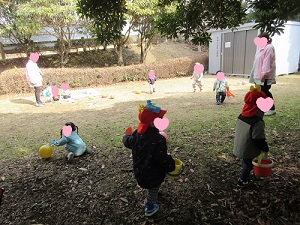 公園で遊びました。探索しながらよちよち歩きの子ども達。どんぐりを見つけてお散歩バックに入れて、にこにこ笑顔。1,2歳児の子ども達は、ボールを追いかけて元気いっぱい遊びました。