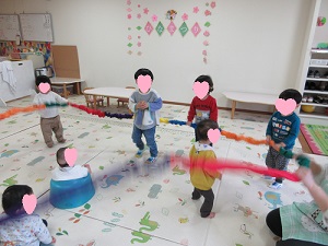 保育者と友だちと輪になり、ドリームバンドを手に持ち「バスにのって」の音楽に合わせて揺らしたり、身体を左右に倒しては起き上がりと繰り返しながら遊びました。発表会でも楽しんでいた子ども達。「もういっかい♪」と言いながら、楽しんでいました。